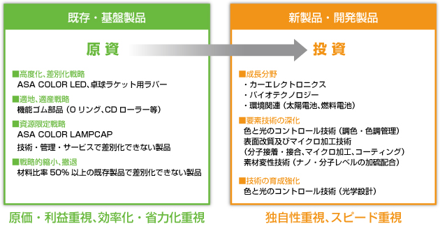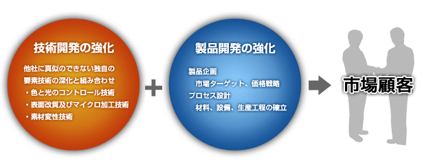 固有の技術力をさらに深化させ、組み合わせることで更なる特徴を生み出すと 同時に、市場の広がりと顧客ニーズを分析し、製品の将来性を考慮した市場ター ゲット戦略と価格戦略を組み立て、最も効率の良い生産体制を整えます。